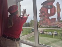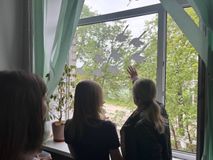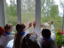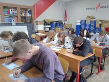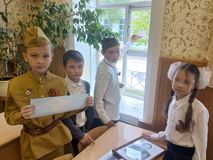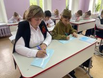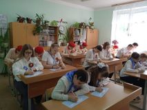 В 10 часов школьники под сопровождением песни Марка Бернеса из кинофильма «Летят журавли» написали на белых бумажных журавлях имена героев Великой Отечественной войны и прикрепили их на окна в классах. Ребята с трепетом выполняли работу, вспоминая истории своих прадедов, воевавших на фронтах Великой Отечественной войны.