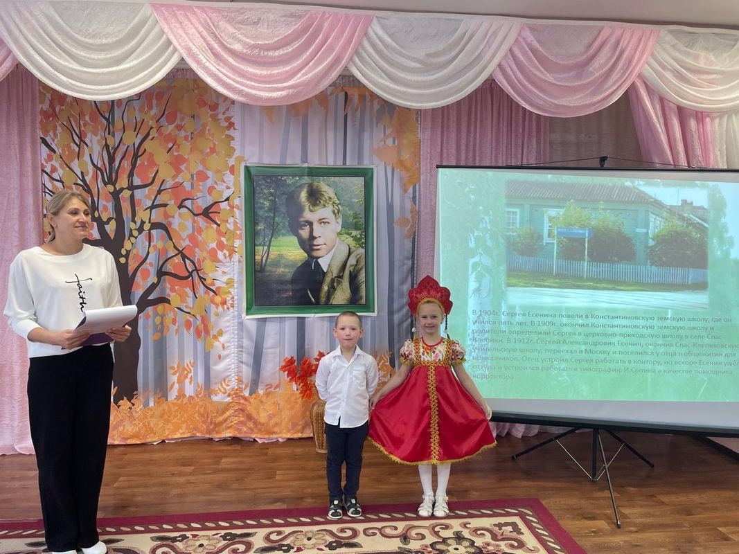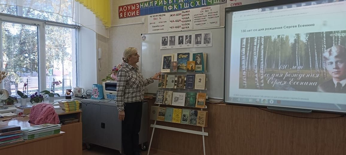 В школах были оформлены выставки, посвященные Сергею Есенину, где ученики могли увидеть его портреты и редкие издания.