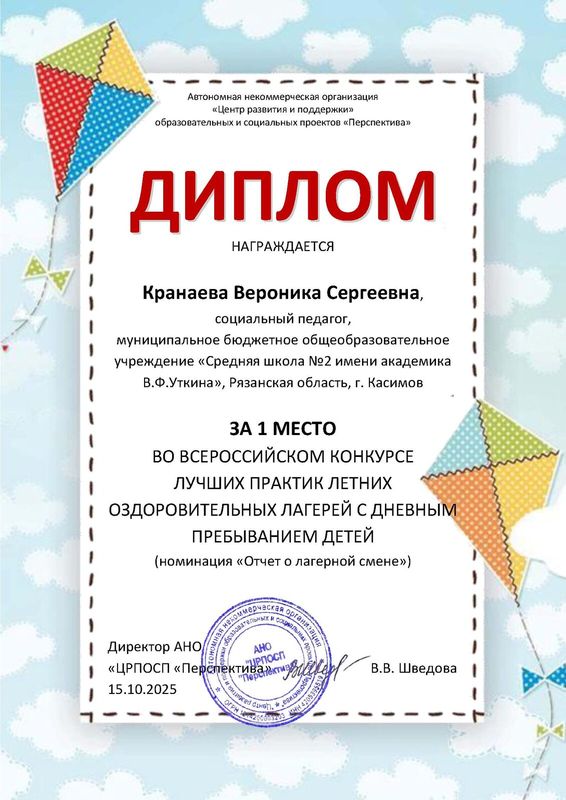С целью выявления и трансляции лучших практик летних оздоровительных лагерей с дневным пребыванием детей, создания условий для реализации творческого потенциала педагогических работников образовательных организаций с 9 июня по 25 октября 2025 года АНО «ЦРПОСП Перспектива» проводился Всероссийский конкурс лучших практик летних оздоровительных лагерей с дневным пребыванием детей.